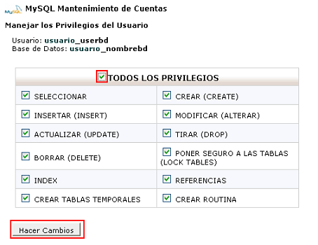 Tildar la opción “TODOS LOS PRIVILEGIOS” y hacer clic en la opción “Hacer Cambios”.